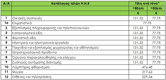 Για όλες τις κατηγορίες, εκτός των «Λαμπτήρες φθορισμού», «Ψυγεία», «Kλιματιστικά» και «Οθόνες και τηλεοράσεις», υπάρχει διαχωρισμός μεταξύ μικρών και μεγάλων συσκευών και διαφορετικά τέλη για τα δύο. Ο λόγος του διαχωρισμού των συσκευών οφείλεται στο μέγεθος των συσκευών καθώς π.χ. μια μεγάλη συσκευή χρειάζεται περισσότερο χώρο για μεταφορά και για αποθήκευση, περισσότερο χρόνο κατά την διαχείριση και από την άλλη παρέχει περισσότερα μέταλλα και ως εκ τούτου το κόστος της είναι χαμηλότερο από μια μικρή συσκευή που δεν περιέχει μέταλλα.